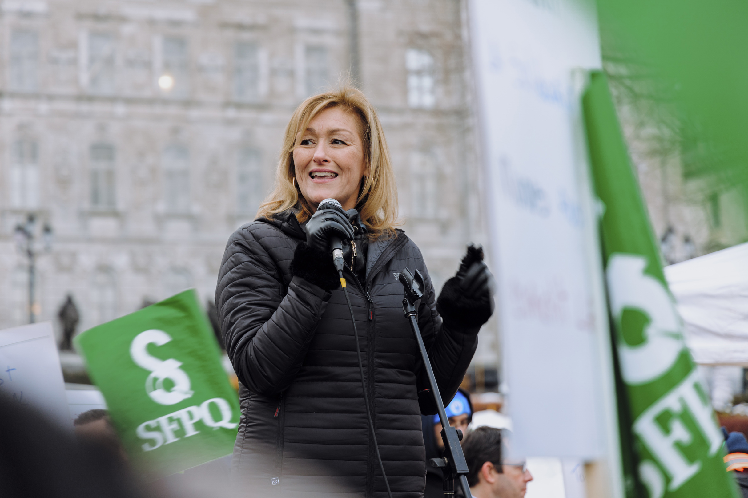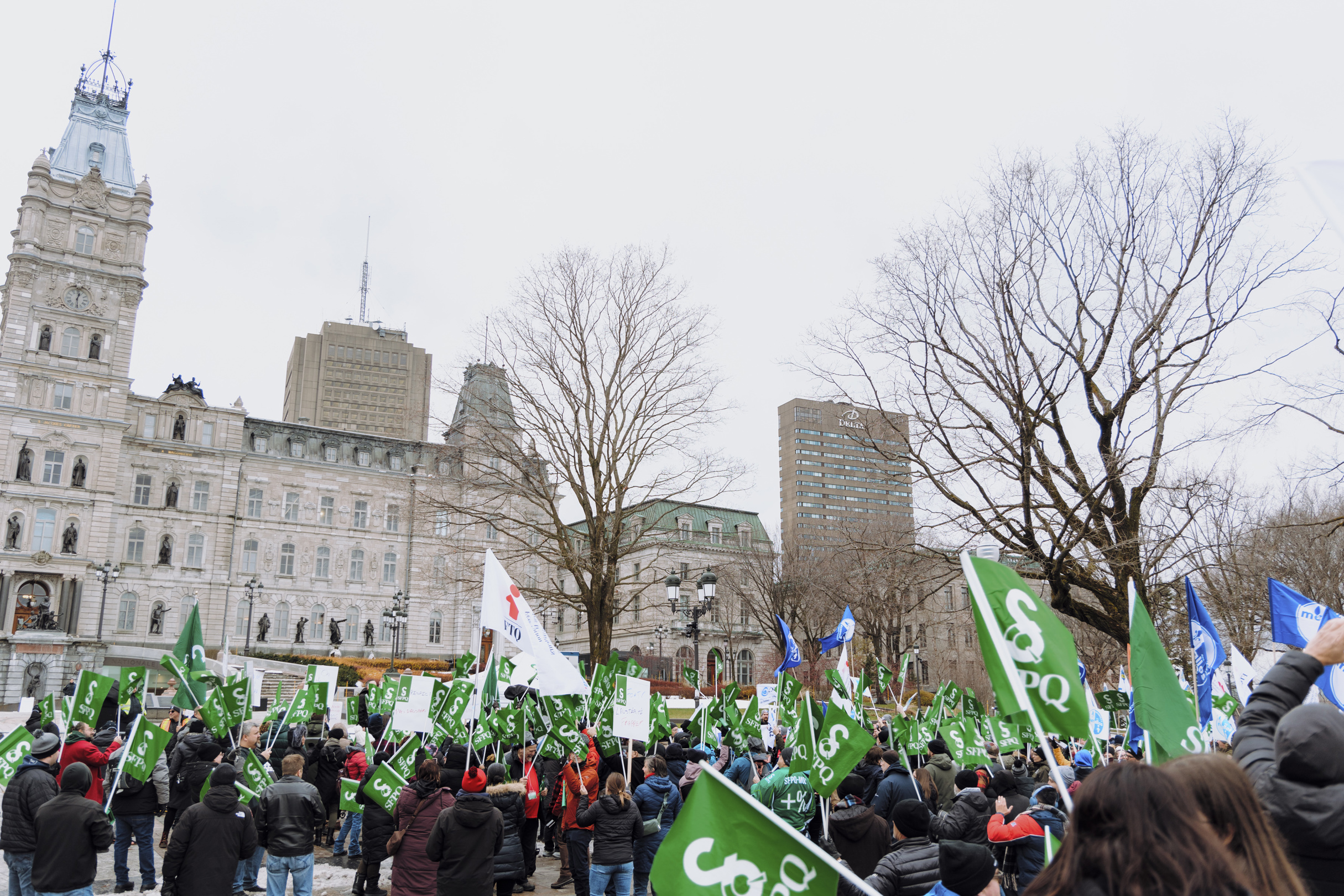 Des centaines de membres de la Fédération des travailleurs et travailleuses du Québec (FTQ) et du Syndicat de la fonction publique et parapublique du Québec (SFPQ) ont manifesté aux abords de l’Assemblée nationale ce jeudi midi.
