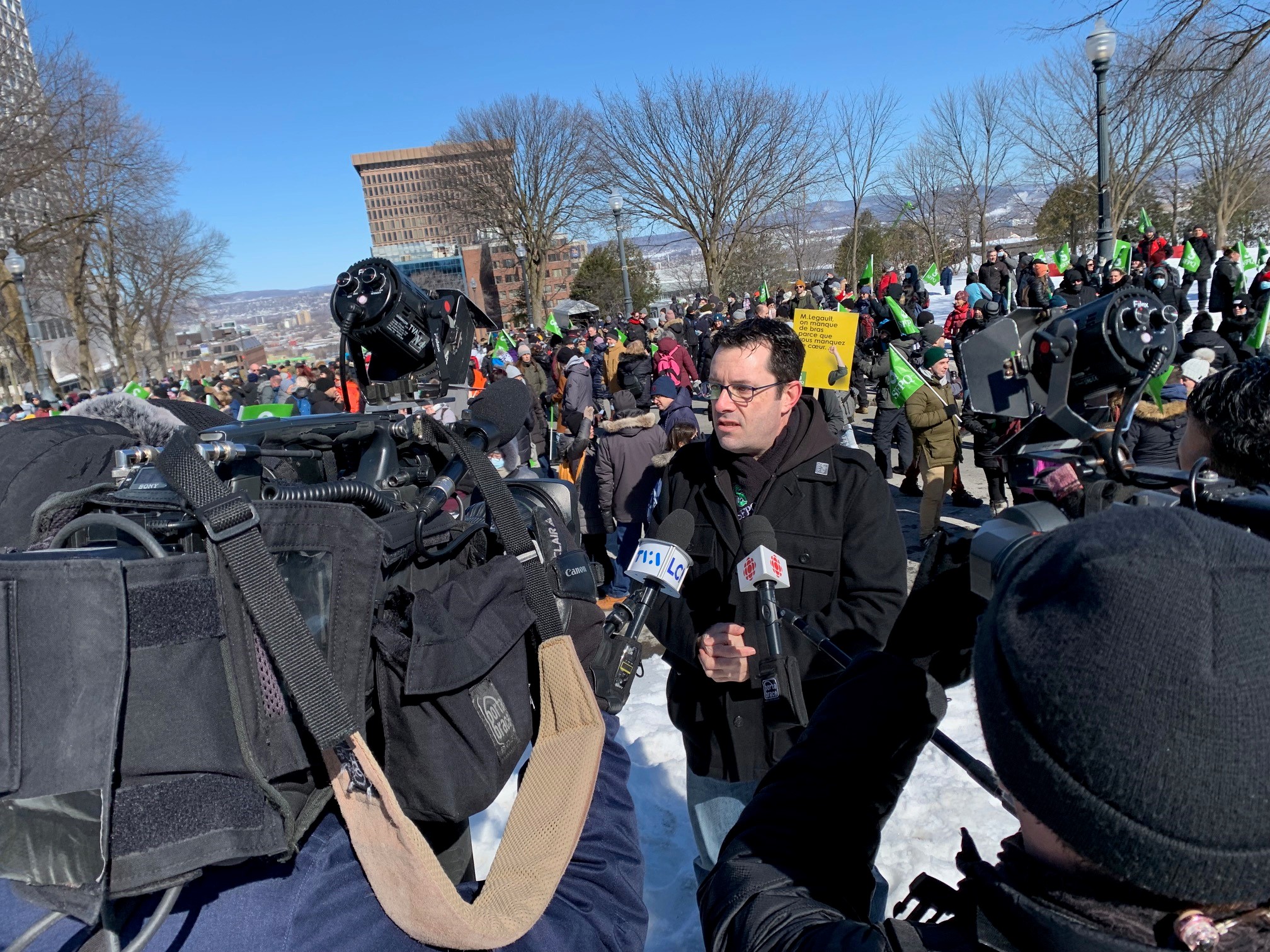 Des centaines de membres du Syndicat de la fonction publique et parapublique du Québec (SFPQ) et du Syndicat de professionnelles et professionnels du gouvernement du Québec (SPGQ) manifestent ce midi aux abords de l’Assemblée nationale afin de réclamer une hausse salariale digne de celle que viennent de s’attribuer les députés.