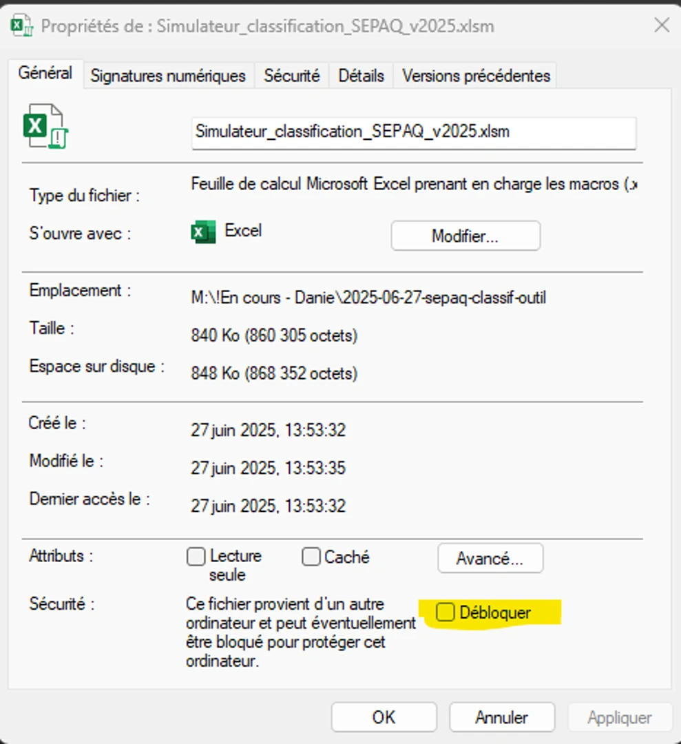 Si vous avez une version récente d'Excel, il est possible que vous deviez débloquer les macros par l'Explorateur de fichiers. Pour ce faire, par un clic droit de la souris sur le fichier, choisissez Propriétés. Débloquer les macros en cochant la case au bas du boîtier des Propriétés.